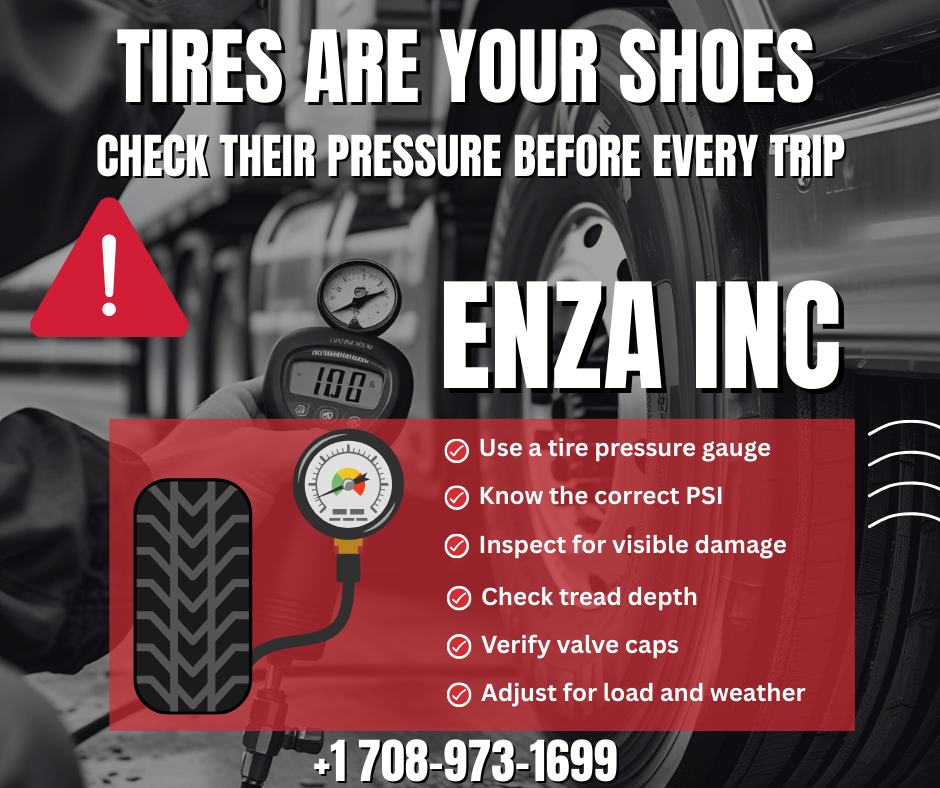 At ENZA INC, your safety is our top priority! Tires are your shoes on the road, and keeping them in perfect condition is essential for every trip. Always use a tire pressure gauge, know the correct PSI for your vehicle, inspect for visible damage, check tread depth, verify valve caps, and adjust for load and weather conditions.